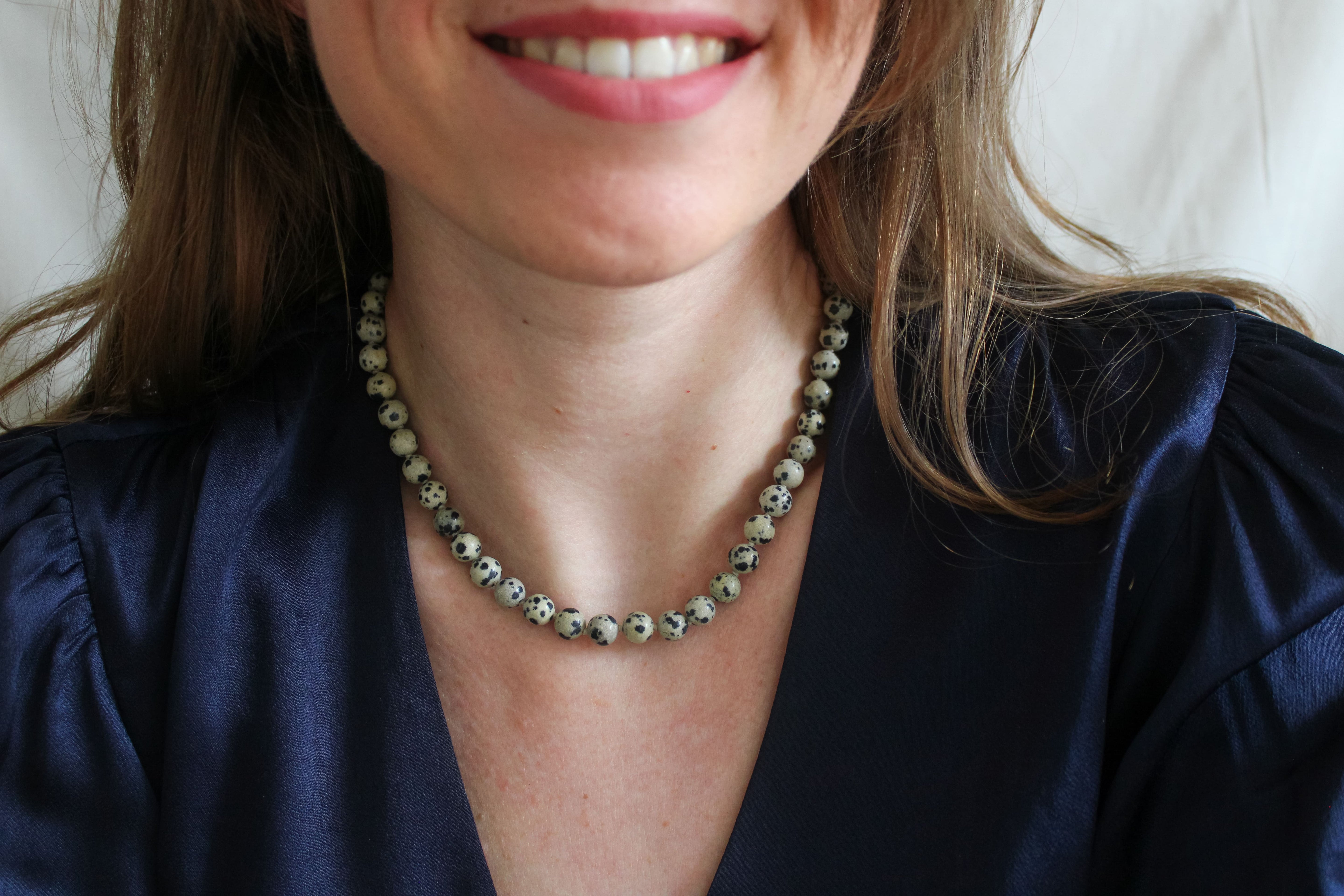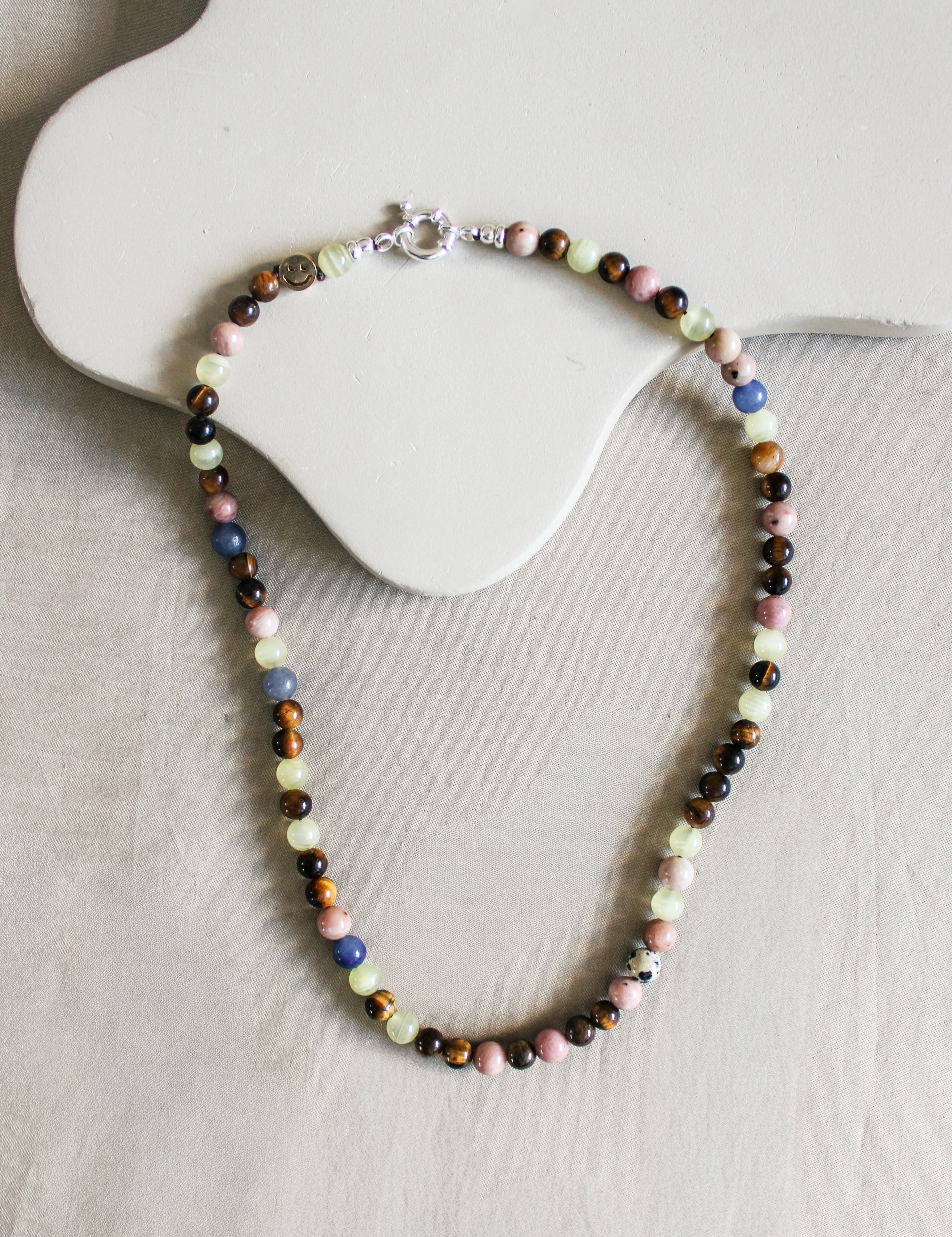De upcycled parels en edelstenen worden met de hand geknoopt aan Linhasita koord. Kleur- en slijtvast, waterafstotend en onder eerlijke omstandigheden gemaakt in Brazilië.