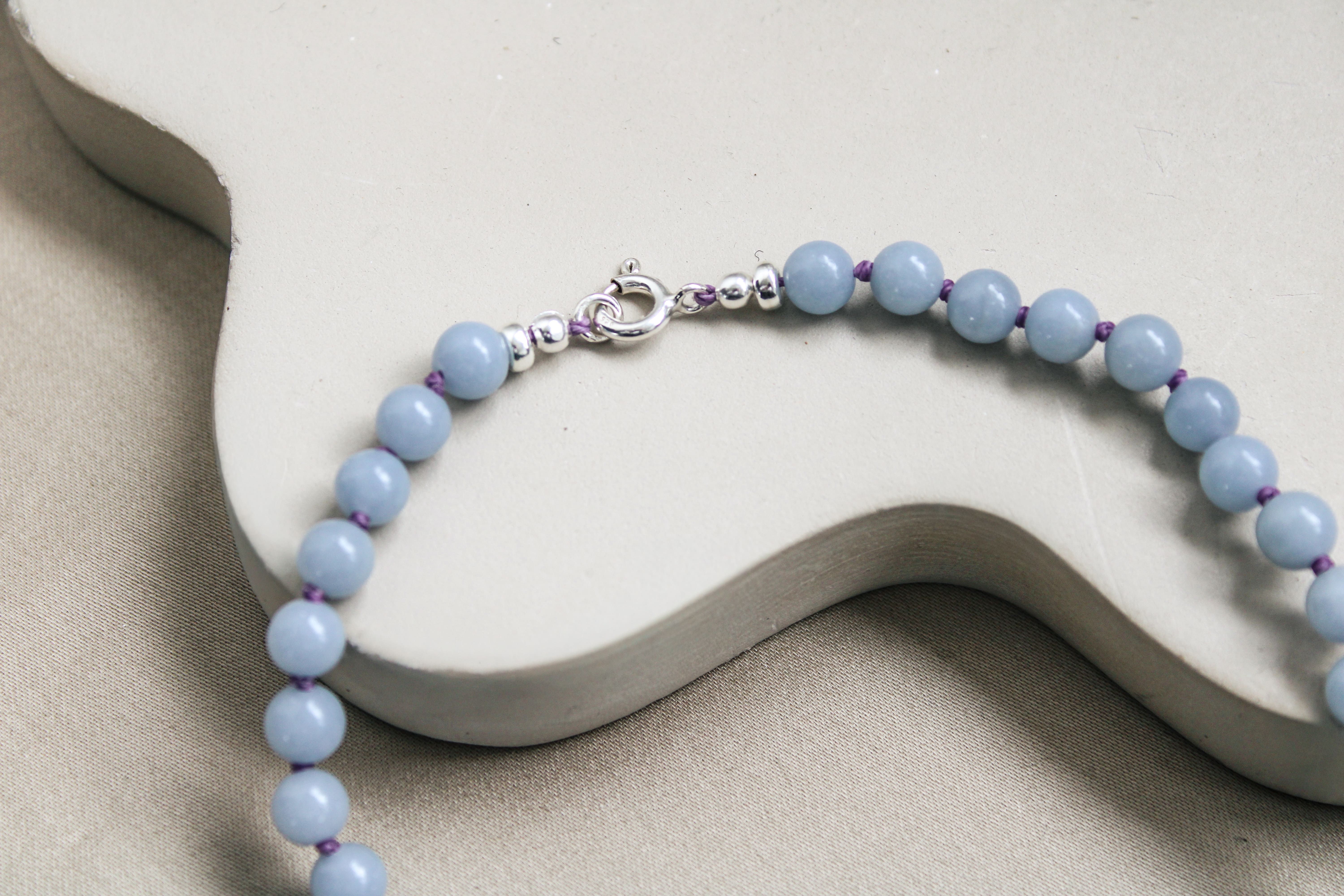 De kralen zijn met de hand geknoopt op lavendelkleurig hennepkoord, wat het blauw een nog zachtere ondertoon geeft. Samen zorgen ze voor een subtiele combinatie die licht en harmonieus aanvoelt, zonder nadruk te leggen.