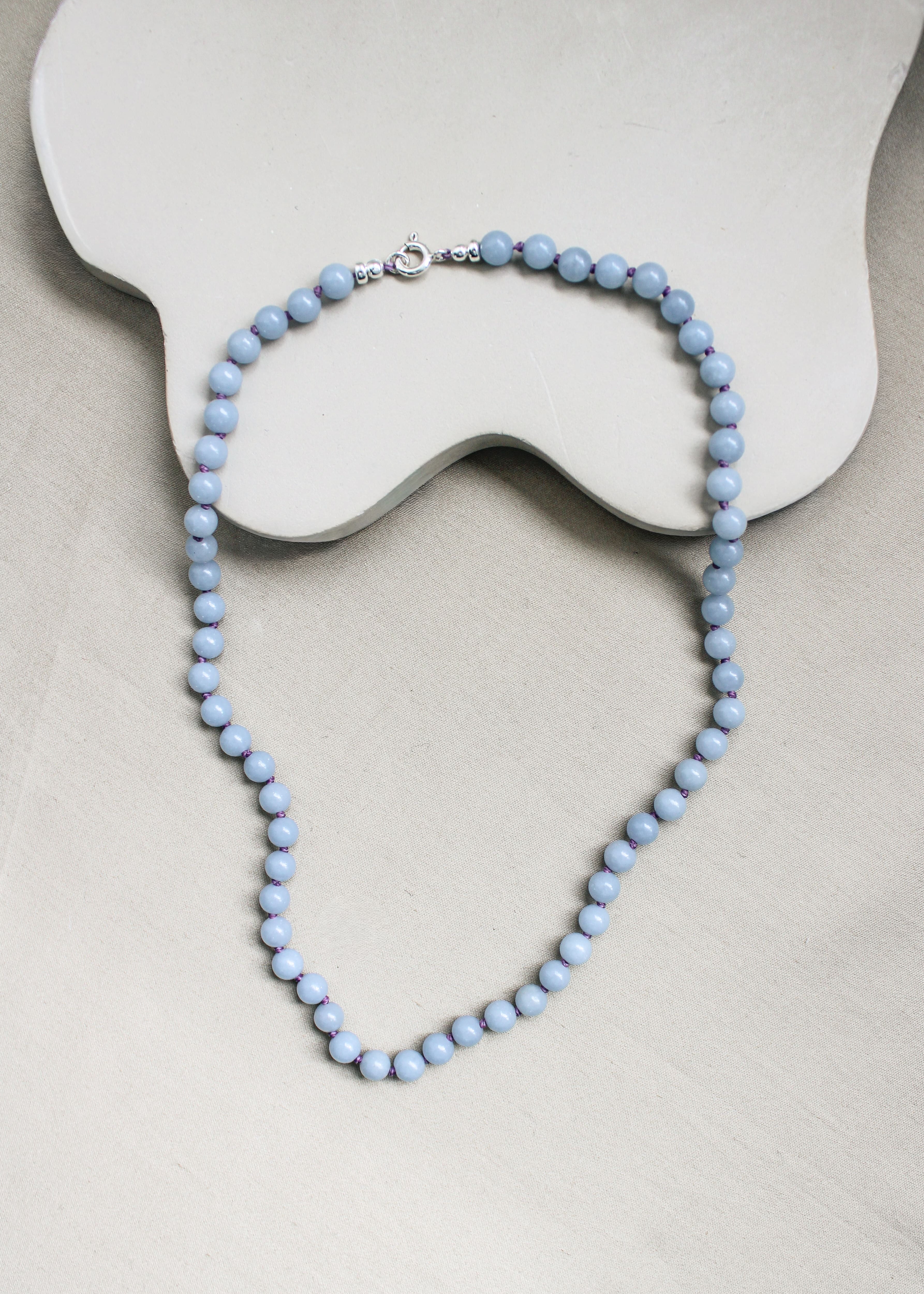 De Inès is een edelsteen ketting van angeliet in een lichte, hemelsblauwe tint. De kleur voelt rustig en open, alsof er ruimte ontstaat. Zacht, maar helder tegelijk. Angeliet wordt vaak geassocieerd met vrede en acceptatie van wat niet te veranderen is.