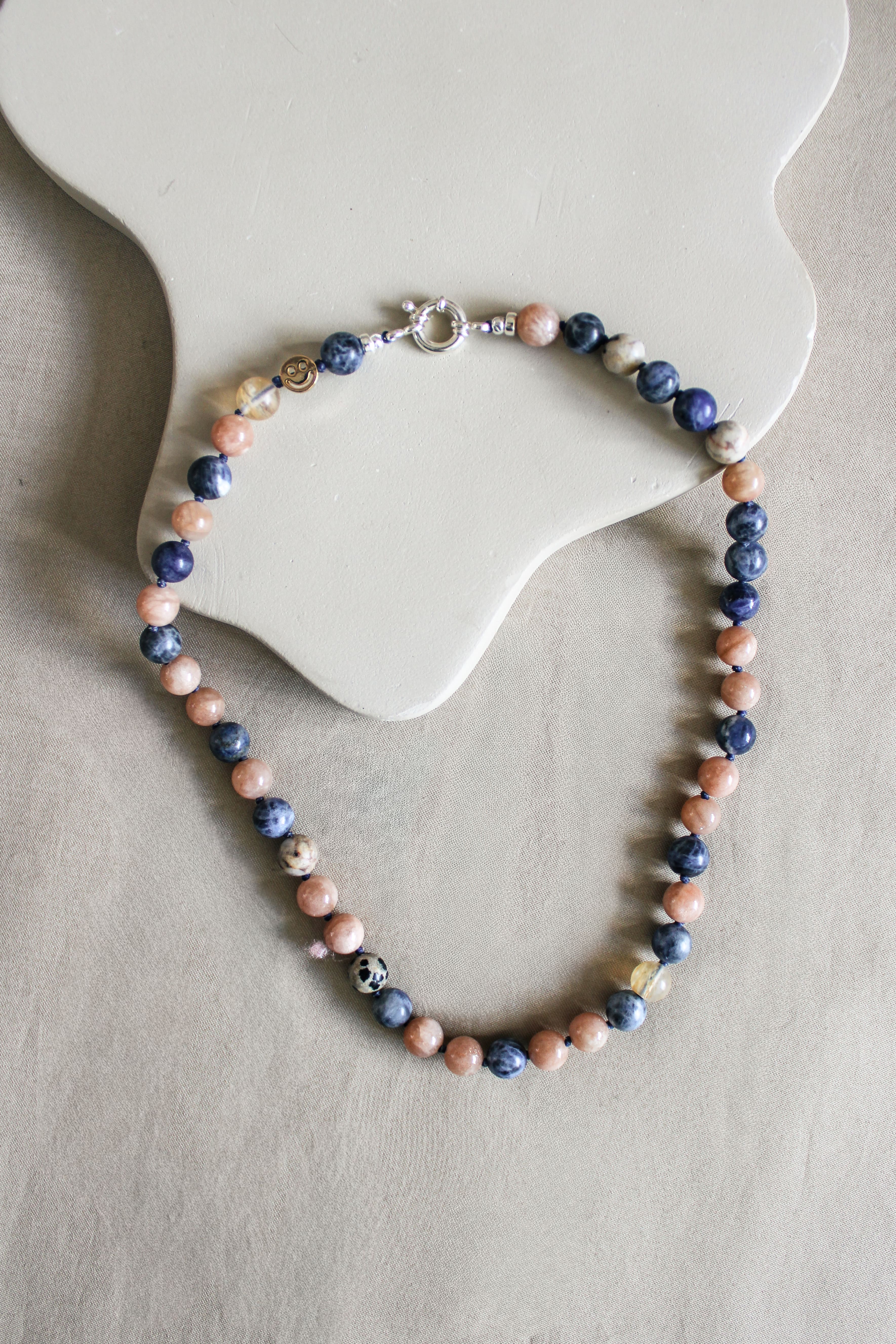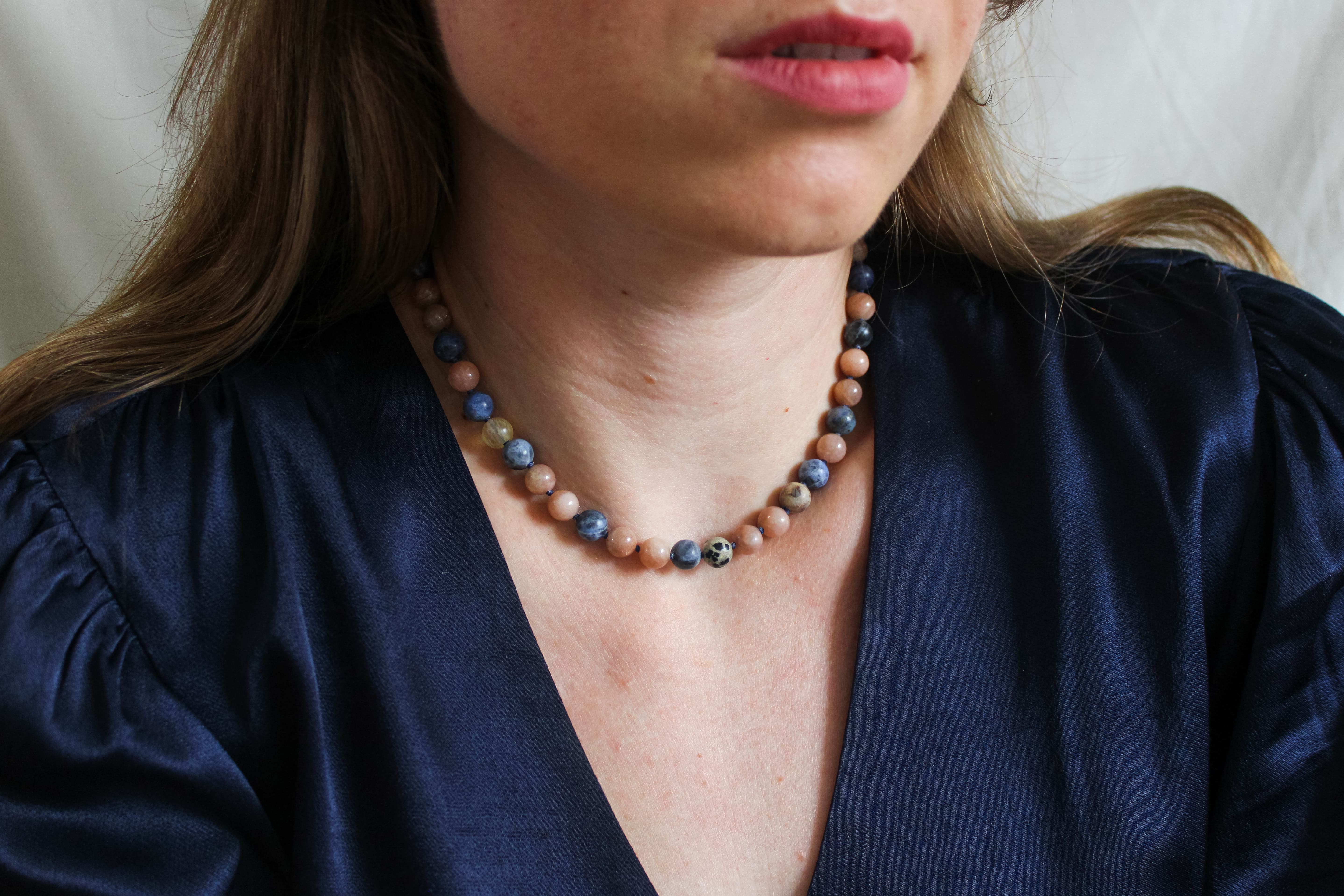 'Ella' Edelsteen Ketting met Sodaliet en Maansteen is gemaakt met upcycled edelstenen van een oud-juwelier in Frankrijk.