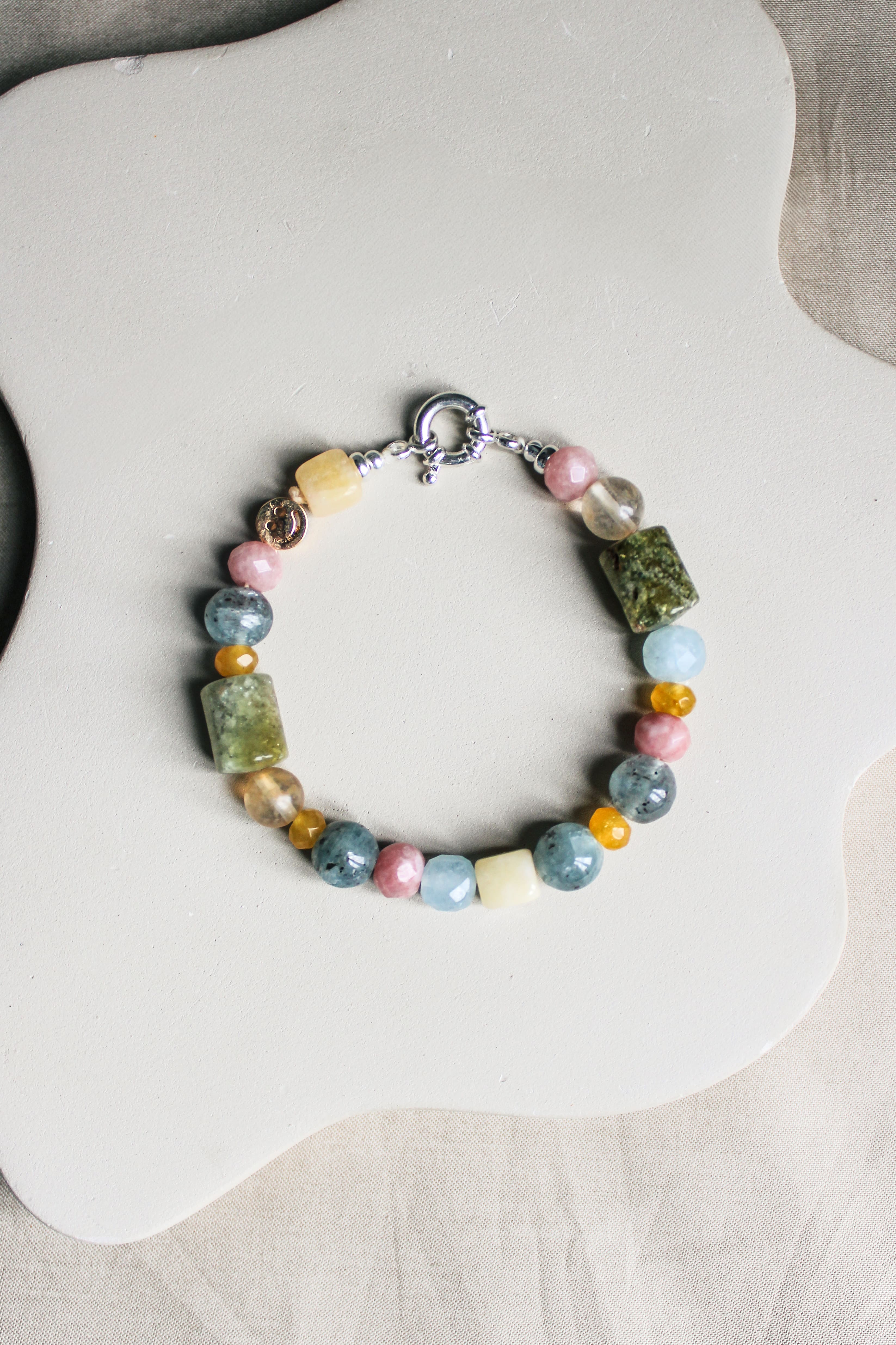 De edelstenen (waaronder citrien, groene granaat en roze opaal) in deze armband zijn afkomstig uit een restpartij uit Frankrijk en Italië. Combinatie staat voor vreudge, balans en energie.