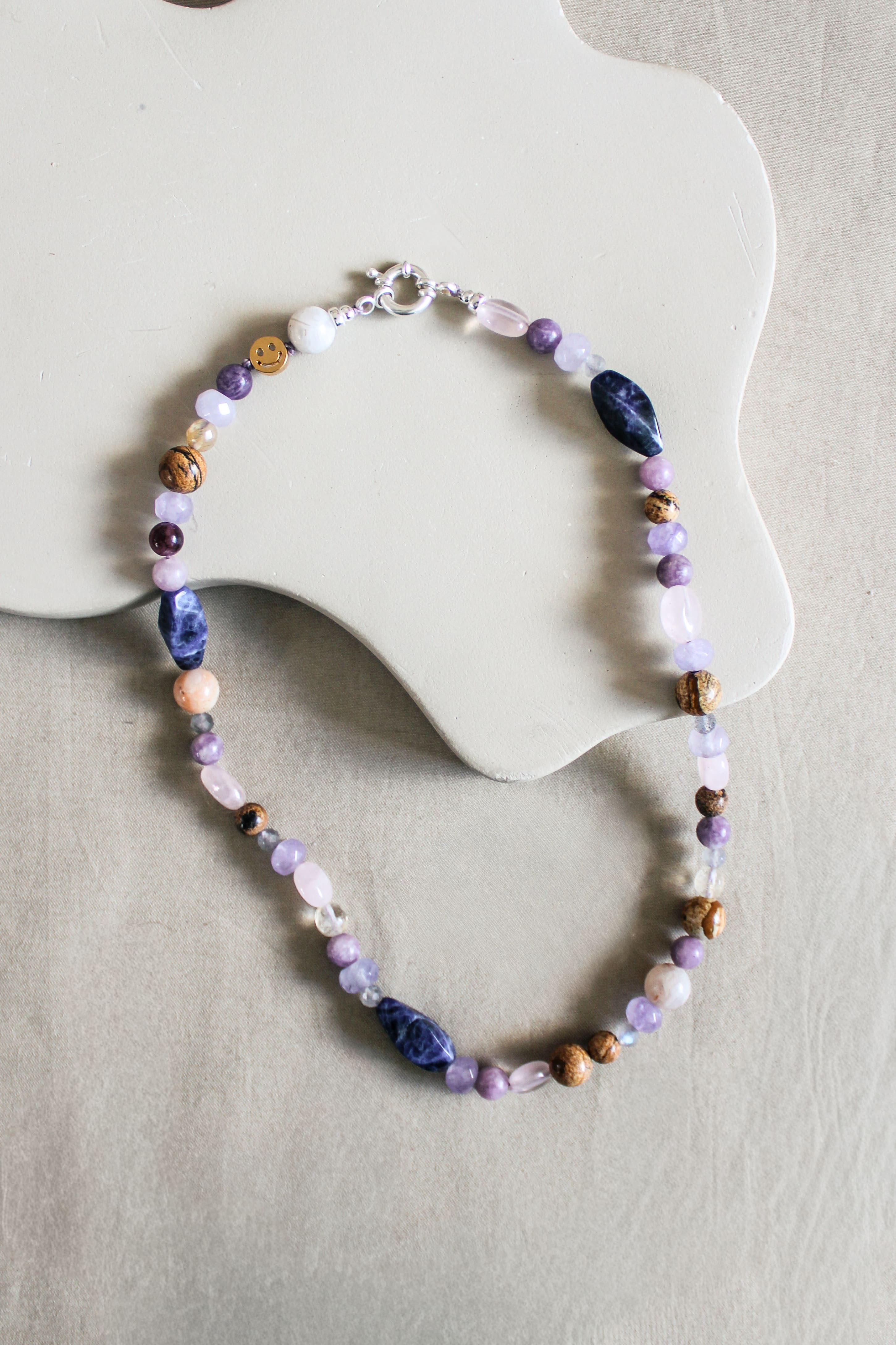 'Heather' Edelsteen Ketting met Amethist is gemaakt met upcycled edelstenen (waaronder amethist, lepidoliet, sodaliet en jaspis) van een oud-sieradenmakers in Europa.