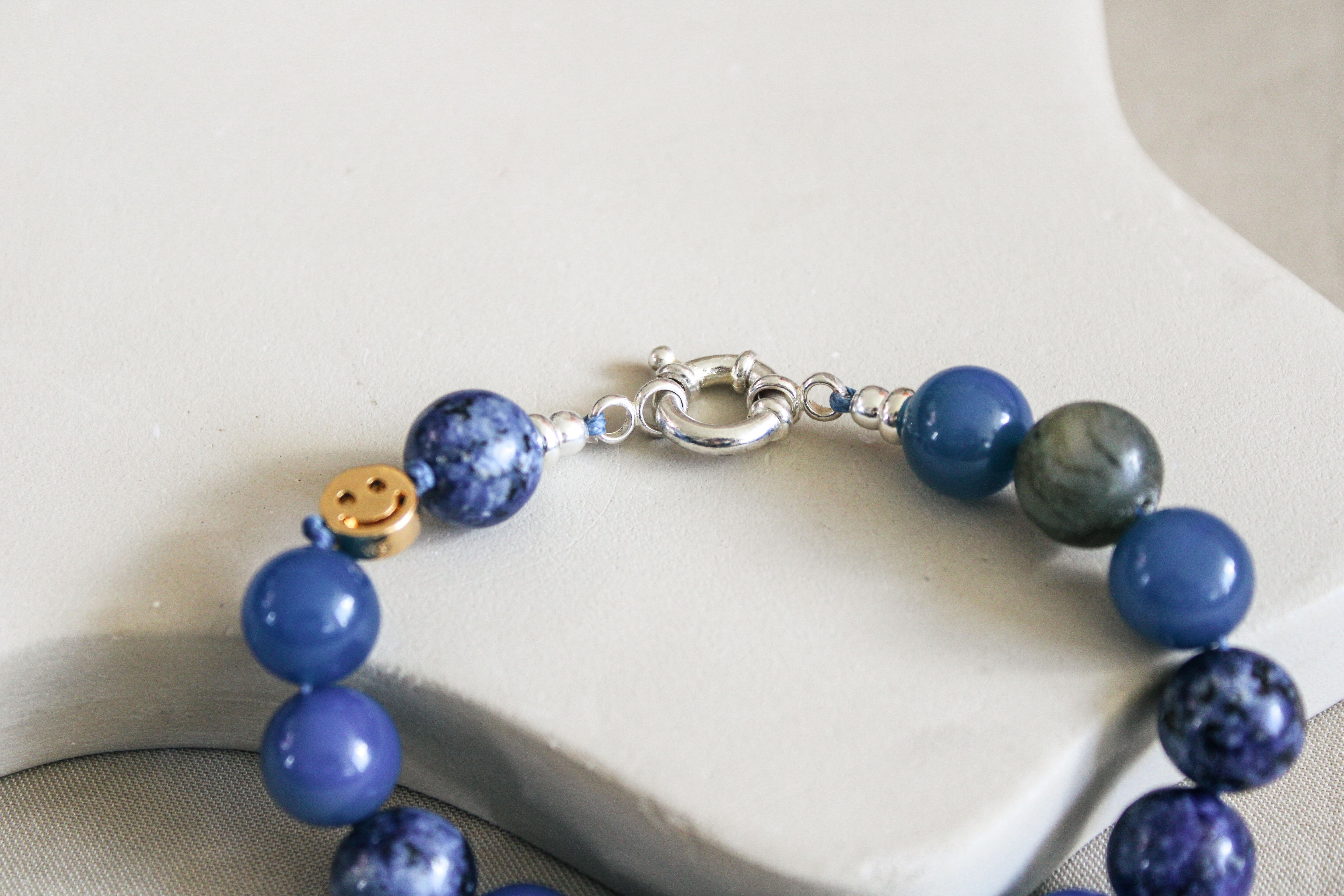 De 'Julie' Edelsteen Armband met Blauwe Agaat en Labradoriet is handgemaakt met edelstenen (blauwe agaat, mosagaat, labradoriet en blauwe jaspis) van een oud-juwelier uit Frankrijk.