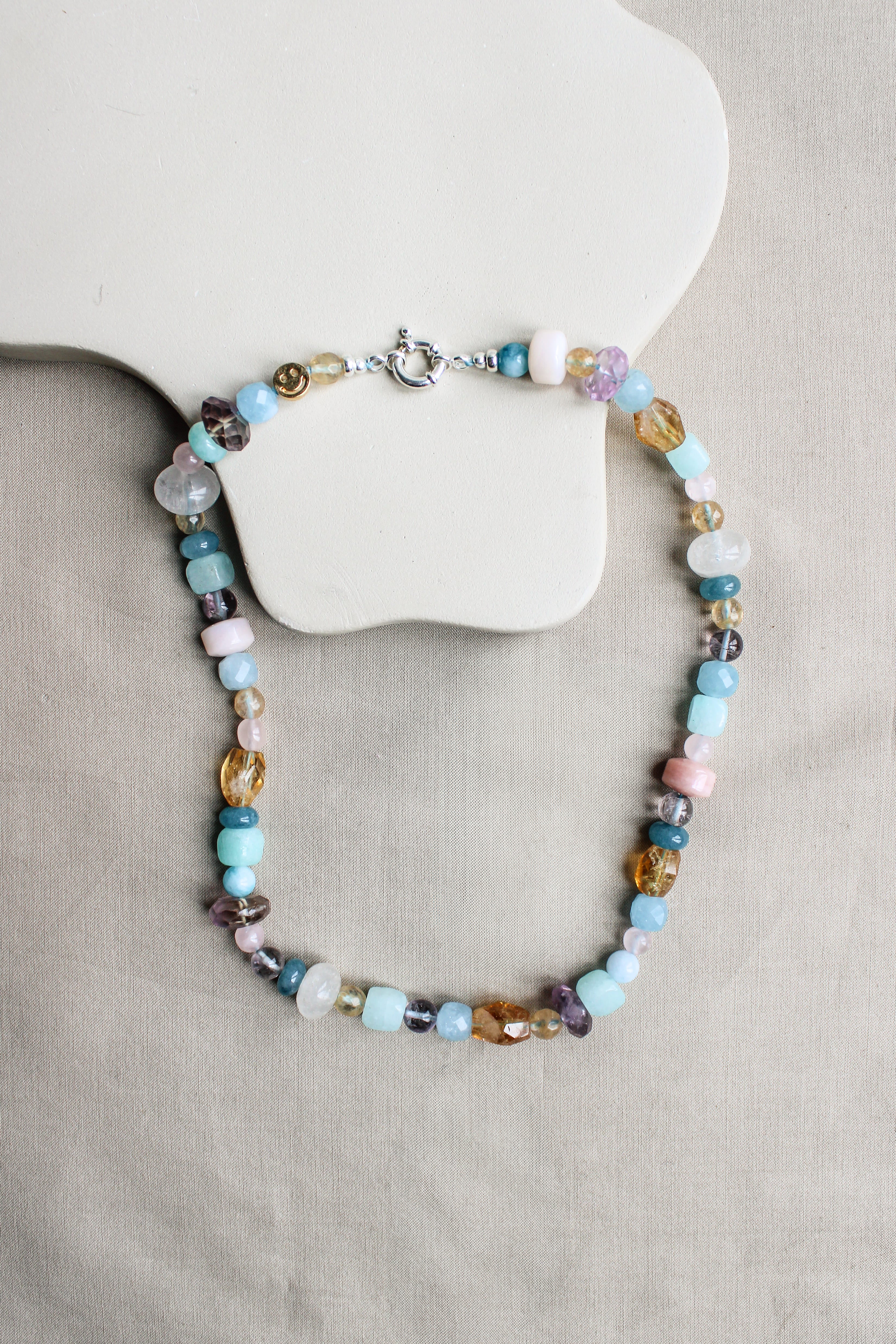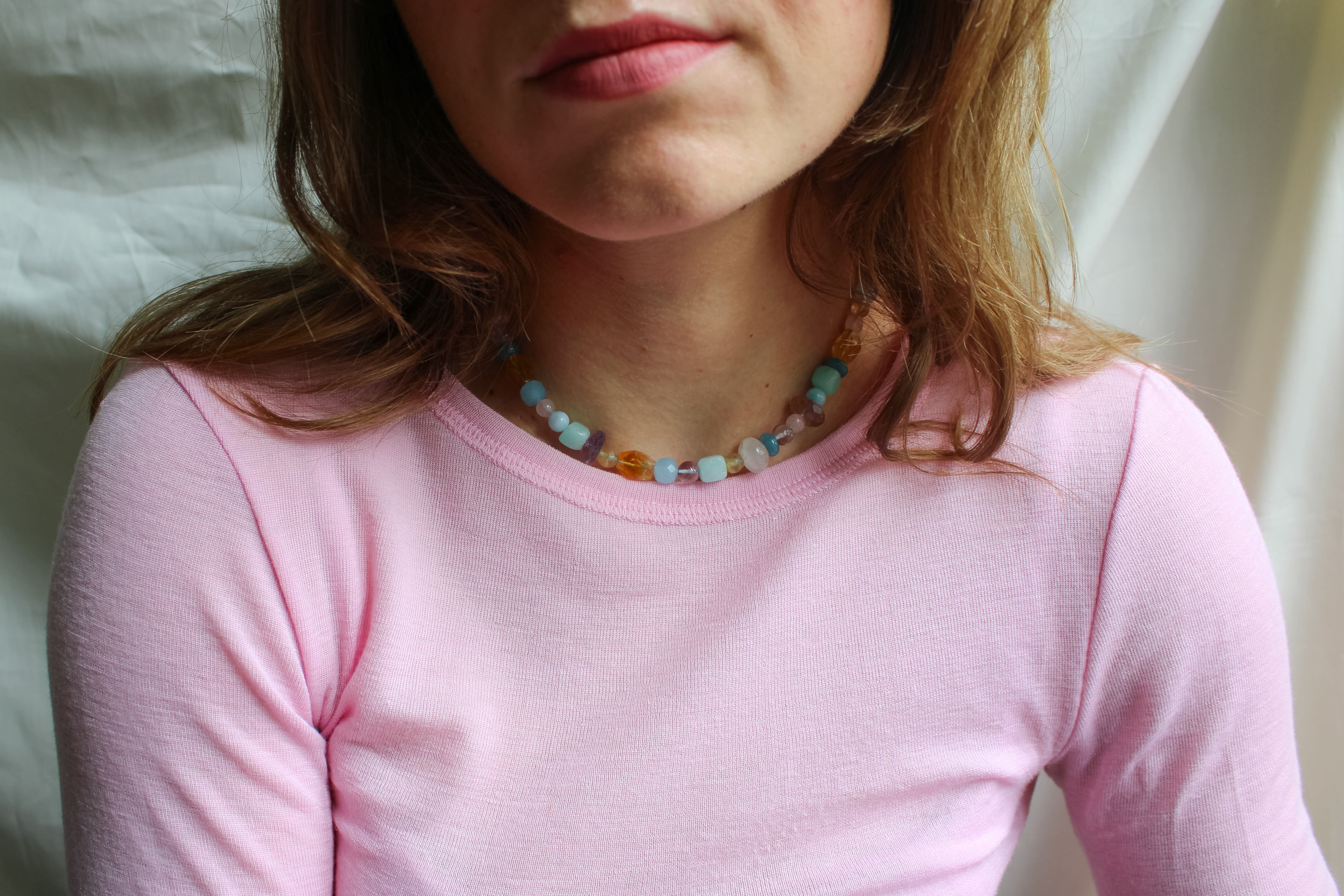 De 'Ona' Edelsteen Ketting met Citrien en Amethist is handgemaakt van restpartijen edelstenen (waaronder citrien, amethist, bergkristal en amazoniet). Overgebleven uit oude collecties van een oud-sieradenmakers uit Europa, opgefrist tot iets nieuws. Ik selecteer de mooiste materialen en geef ze nieuw leven in mijn atelier. Geen massawerk, maar een unieke vondst met karakter en geschiedenis.