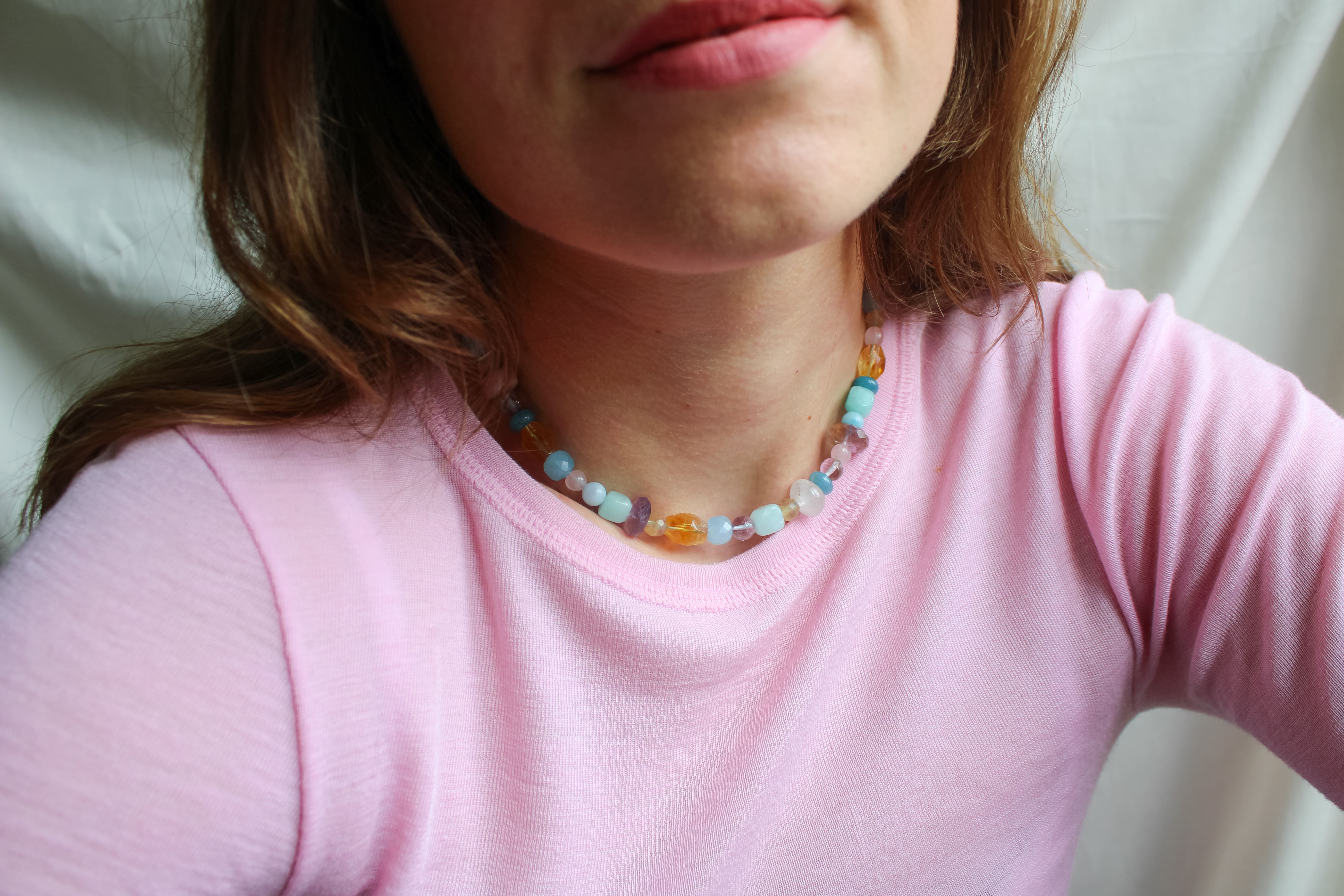 'Ona' Edelsteen Ketting met Citrien en Amethist is gemaakt met upcycled edelstenen (waaronder citrien, amethist, bergkristal en amazoniet) van een oud-sieradenmakers in Europa.