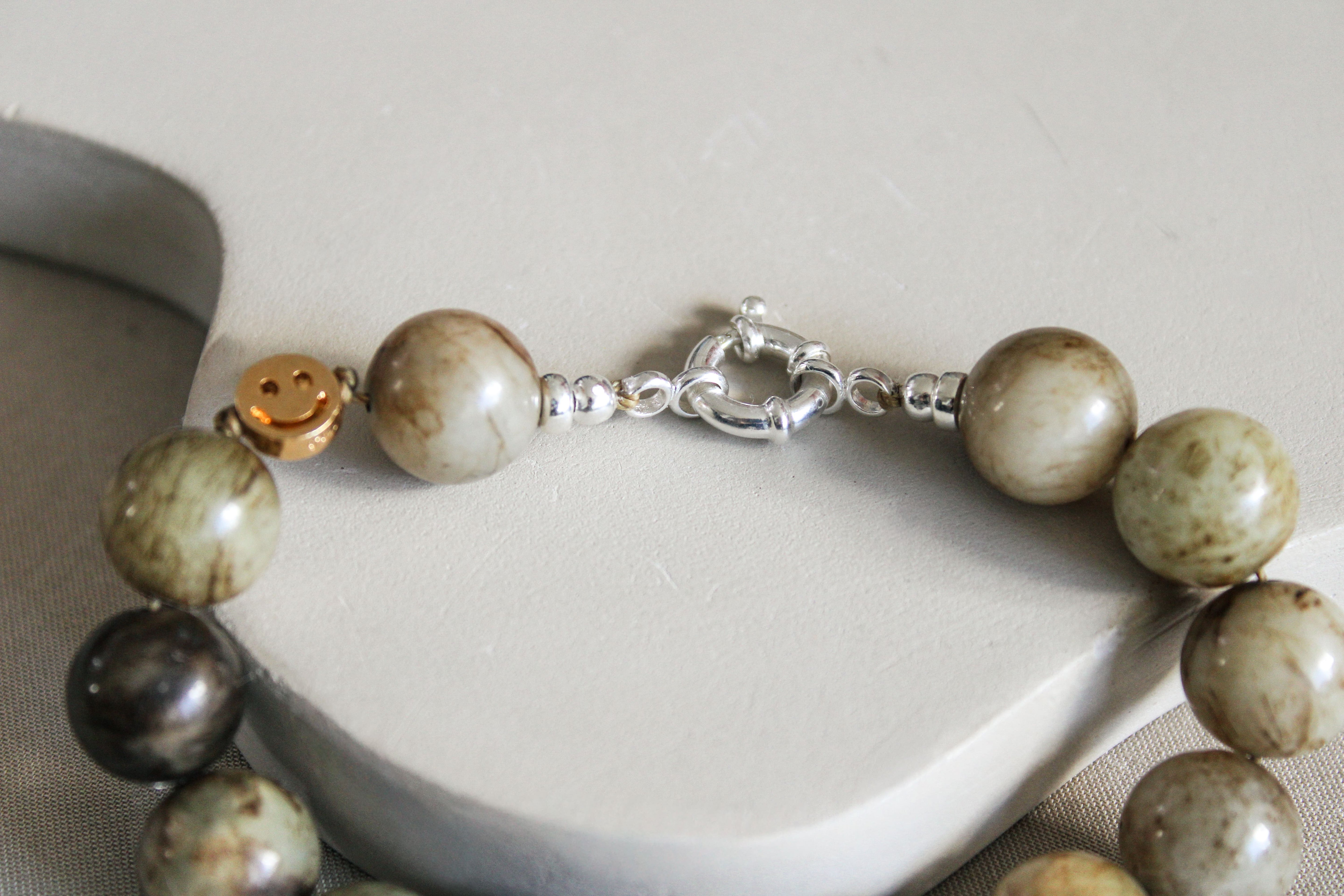 Ik selecteer de mooiste materialen en geef ze nieuw leven in mijn atelier. Deze jade edelstenen zijn ooit overgebleven in het atelier van een oud-juwelier.