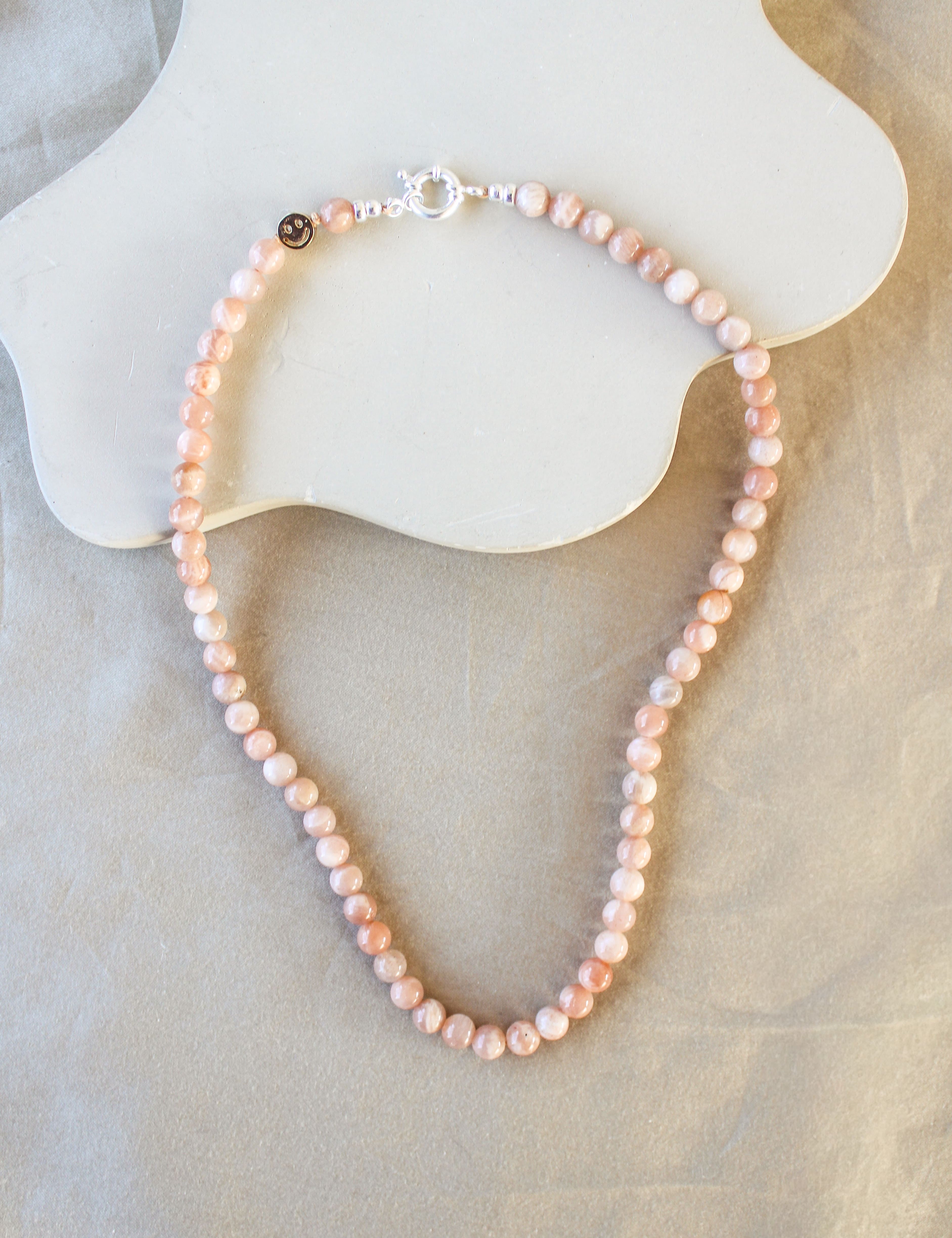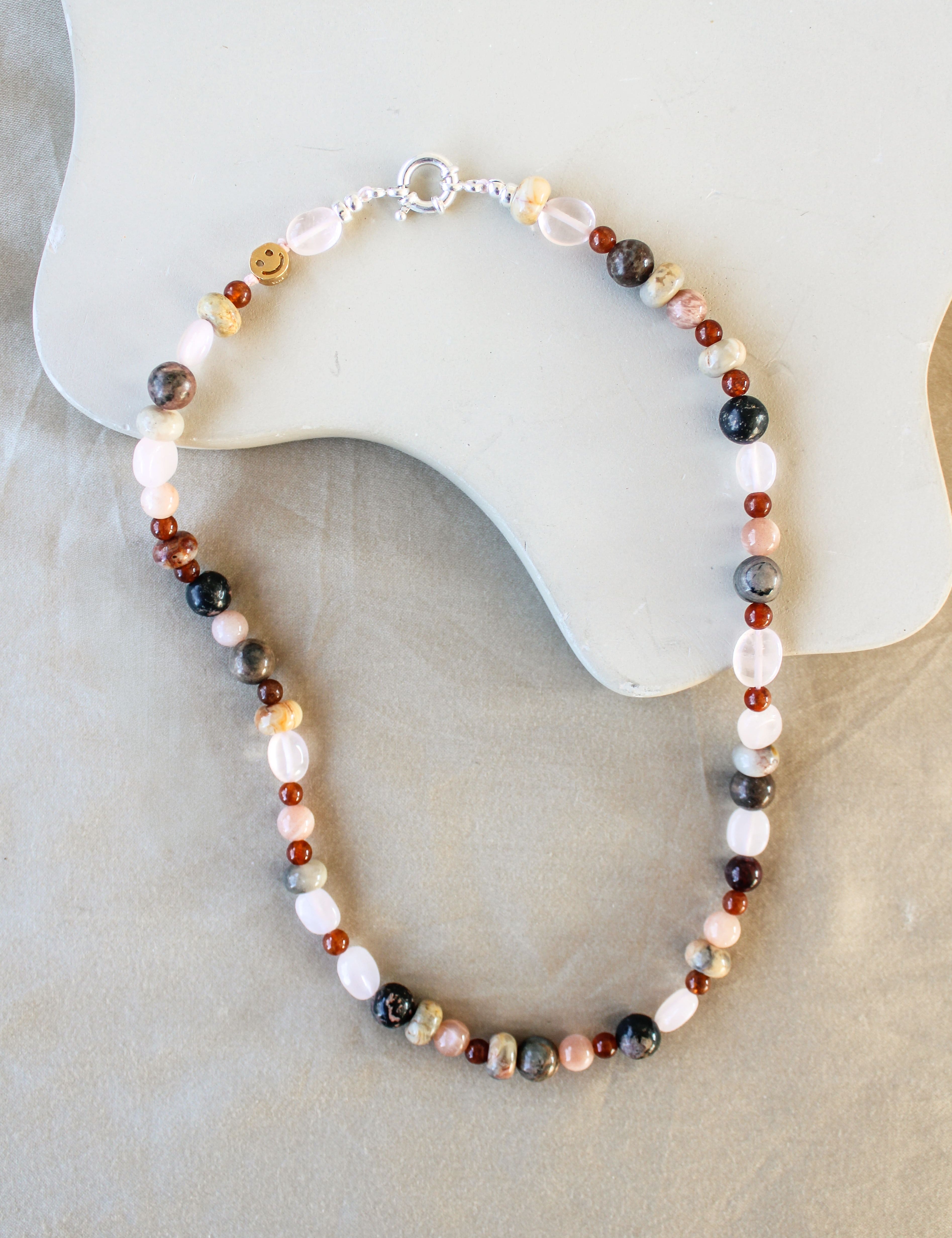 Handgemaakte kettingen die kleur en karakter toevoegen aan een eenvoudige outfit. Elk ontwerp is uniek, met upcycled edelstenen of vintage parels en een luxe sluiting als afwerking.