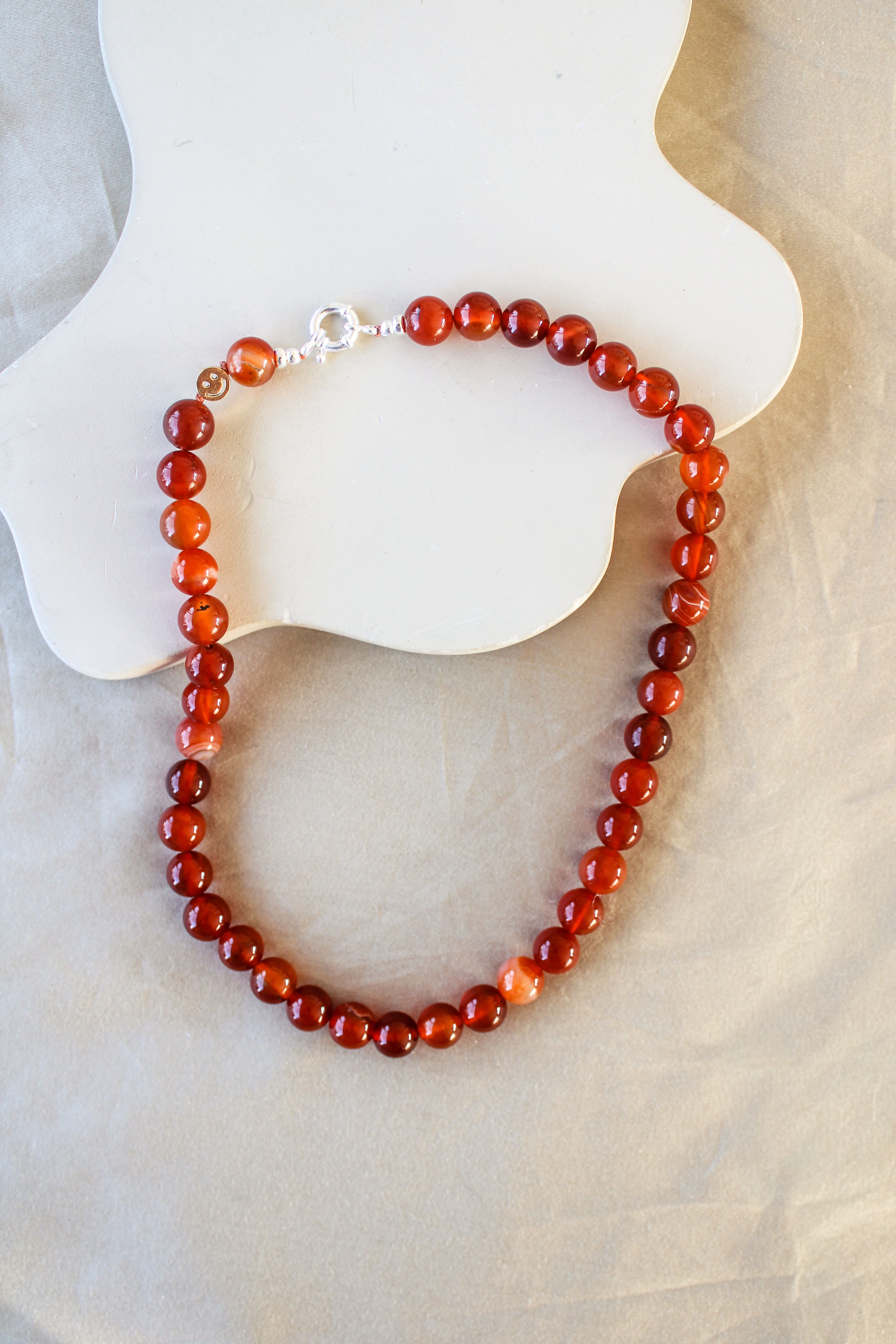 Ik stel elk stuk met de hand samen in mijn atelier in Nederland en werk het pas af na jouw bestelling. Je kiest zelf de lengte, sluiting en eventueel een smile-detail in .925 sterling zilver of 14K gold filled/vermeil, zodat het sieraad écht bij jou past.