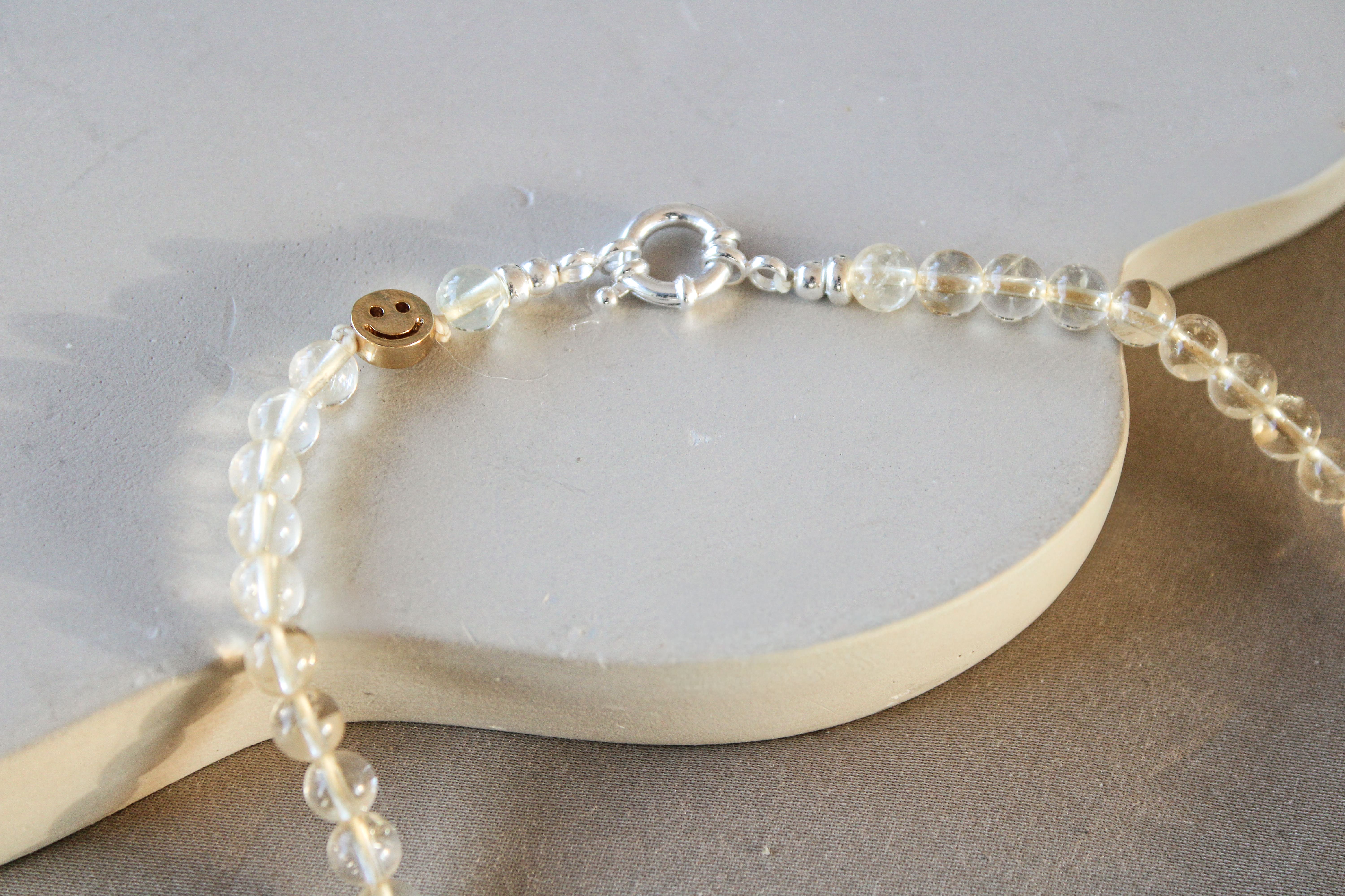 Ik stel elk stuk met de hand samen in mijn atelier in Nederland en werk het pas af na jouw bestelling. Je kiest zelf de lengte, sluiting en eventueel een smile-detail in .925 sterling zilver of 14K gold filled/vermeil, zodat het sieraad écht bij jou past.