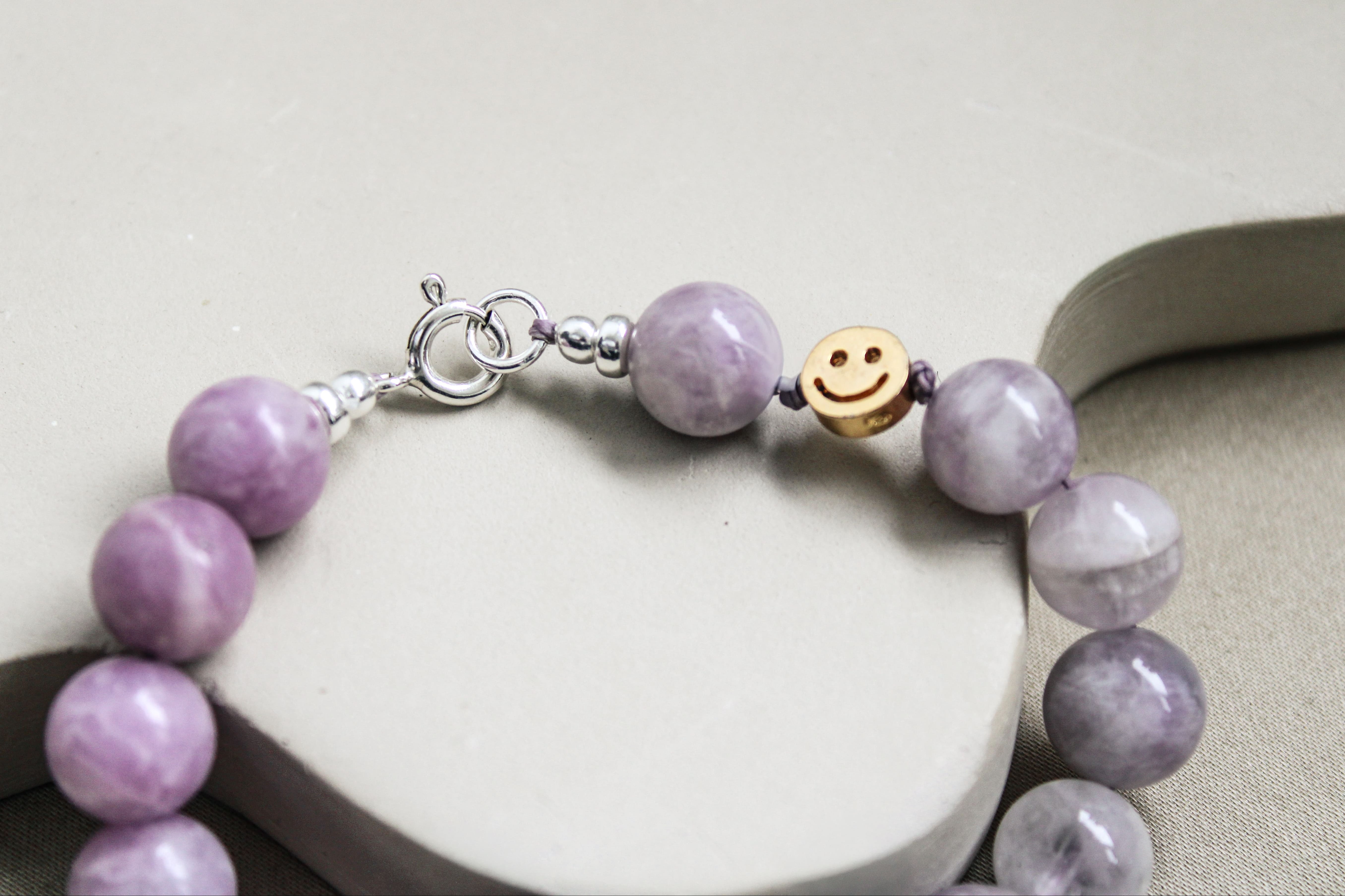 - Edelsteen/materiaal: amethist en lepidoliet
