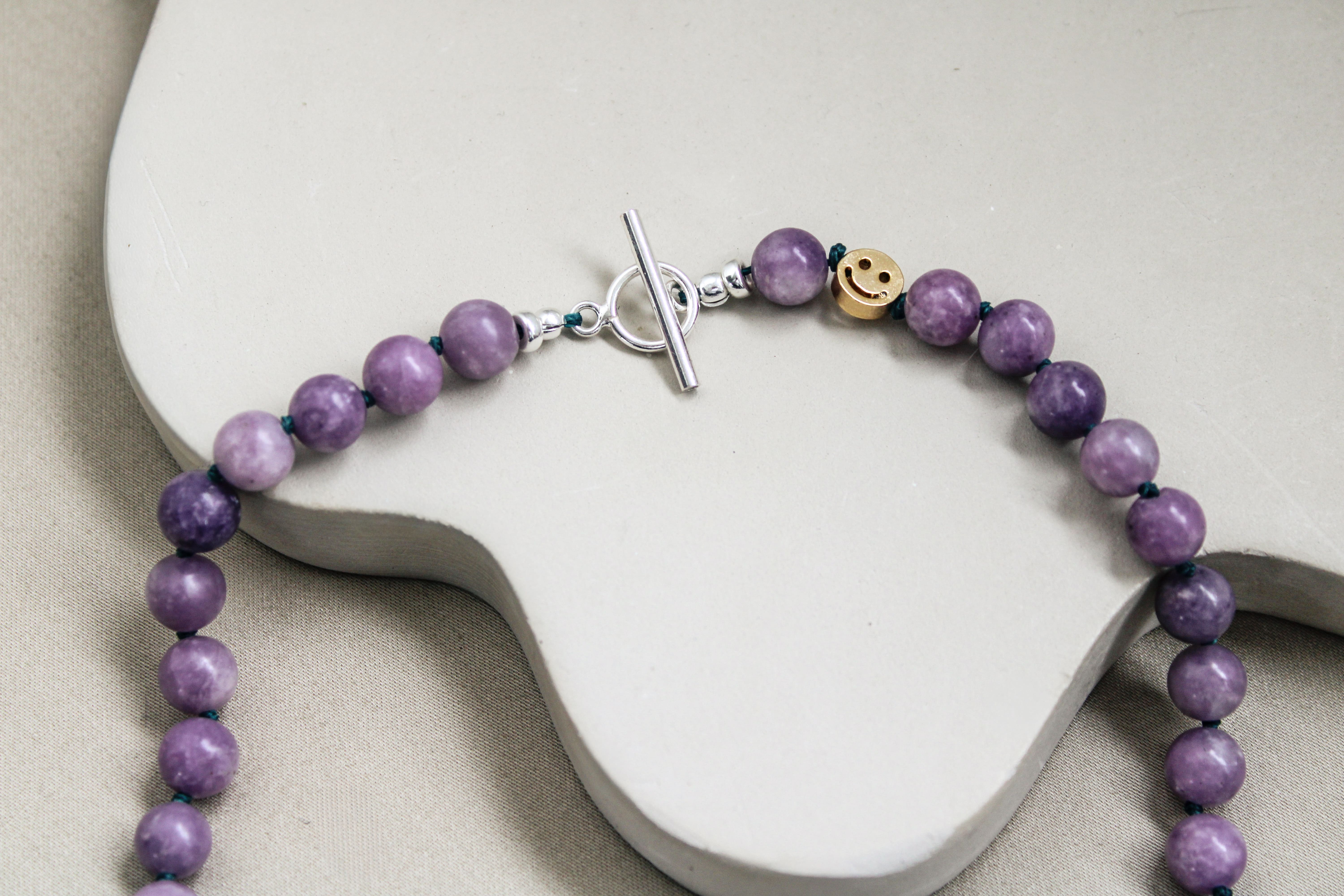 'Emma' is een edelsteen ketting van lepidoliet in een zachte lavendeltint. De kleur voelt rustig en bijna verstild, zoals het moment waarop alles even langzamer lijkt te gaan. Lepidoliet wordt vaak geassocieerd met het verlichten van stress en depressiviteit.