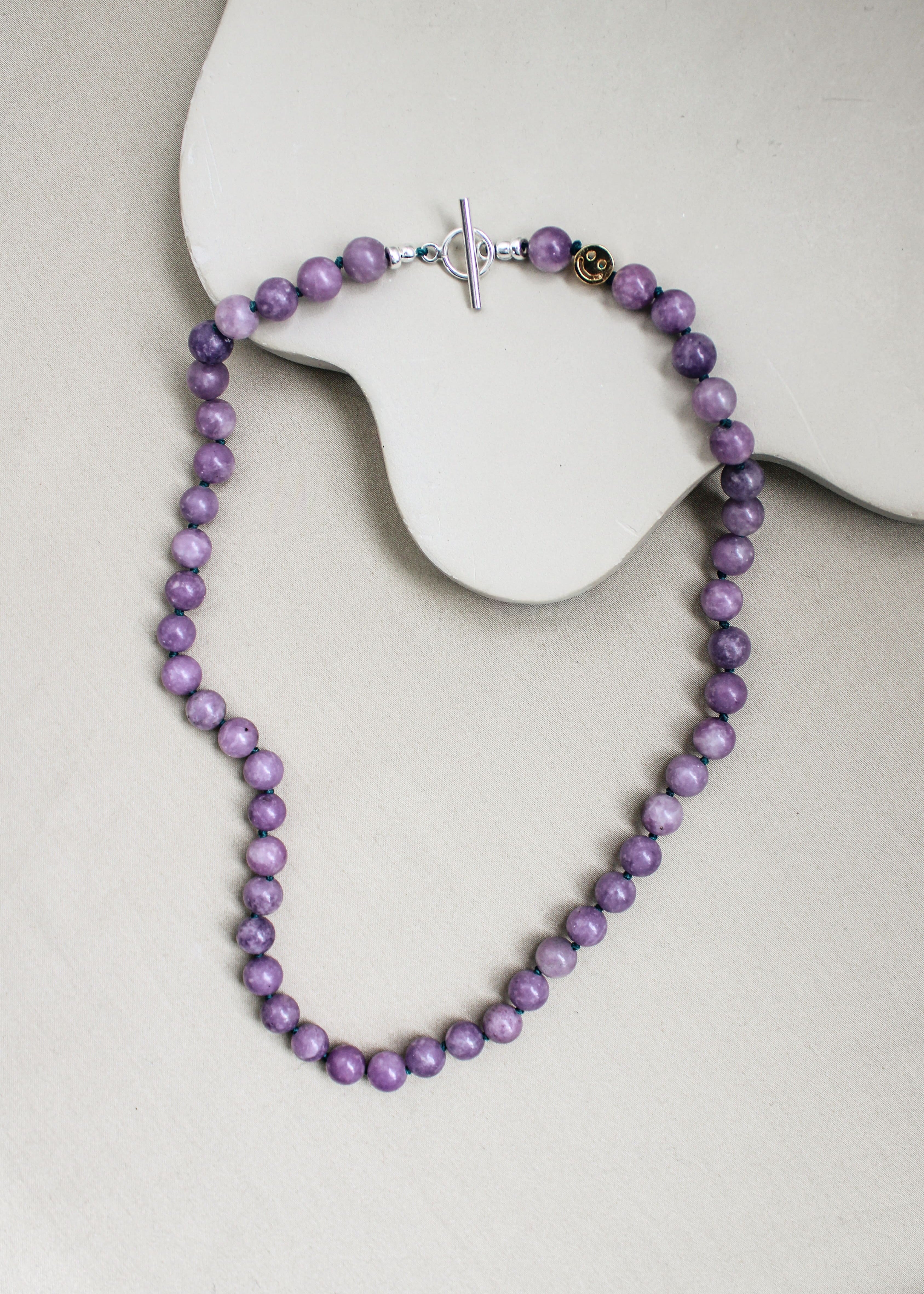 Een lavendelkleurige ketting die rust uitstraalt, met net genoeg aanwezigheid om op te vallen.