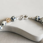 De sluiting is standaard massief .925 sterling zilver, maar kan ook in 14K gold vermeil/gold filled worden toegevoegd. De smile komt standaard in 16K gold plated, maar kan ook in zilver worden toegevoegd.