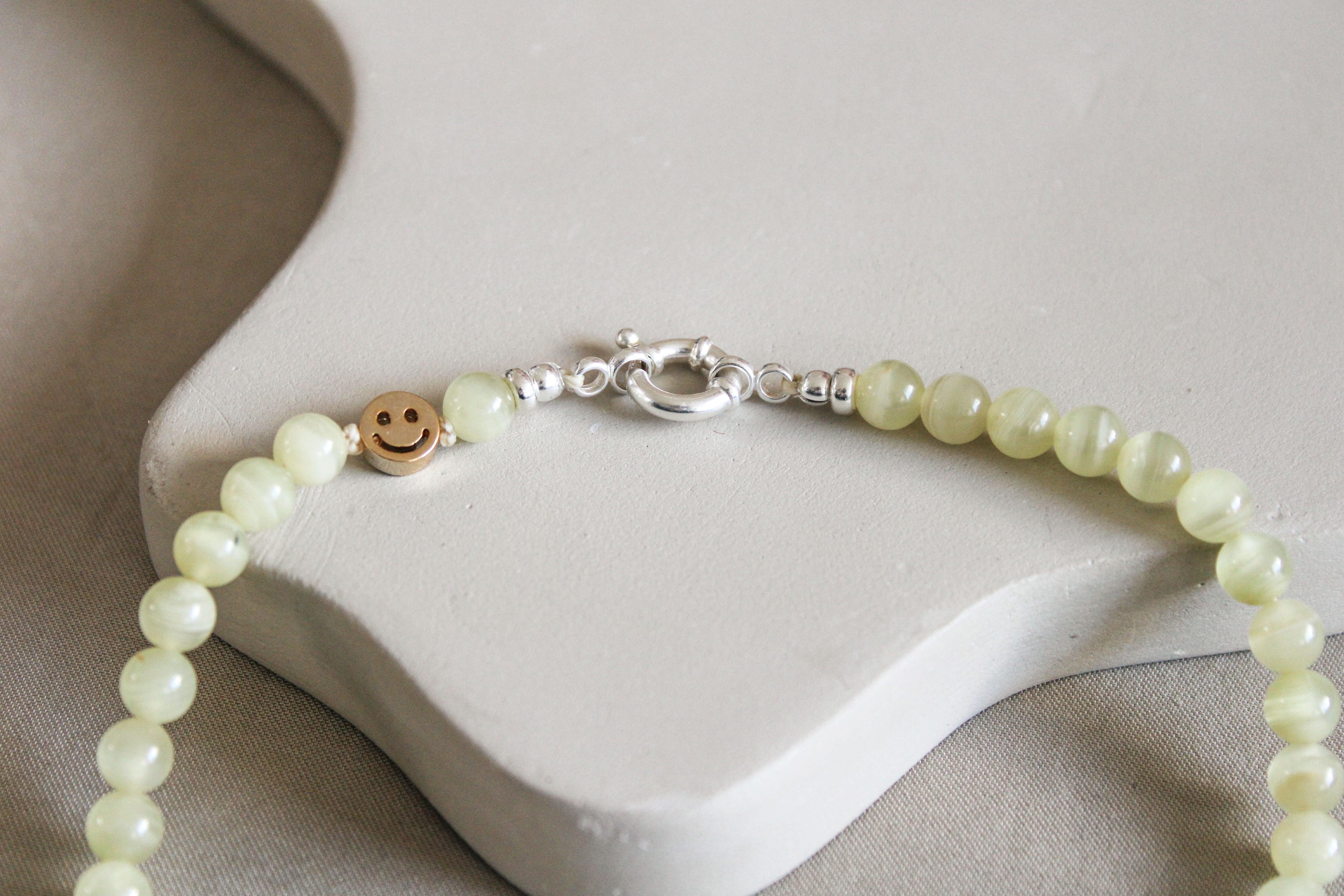 De sluiting is standaard massief .925 sterling zilver, maar kan ook in 14K gold vermeil/gold filled worden toegevoegd. De smile komt standaard in 16K gold plated, maar kan ook in zilver worden toegevoegd.