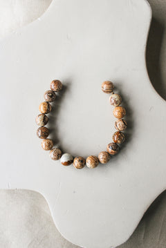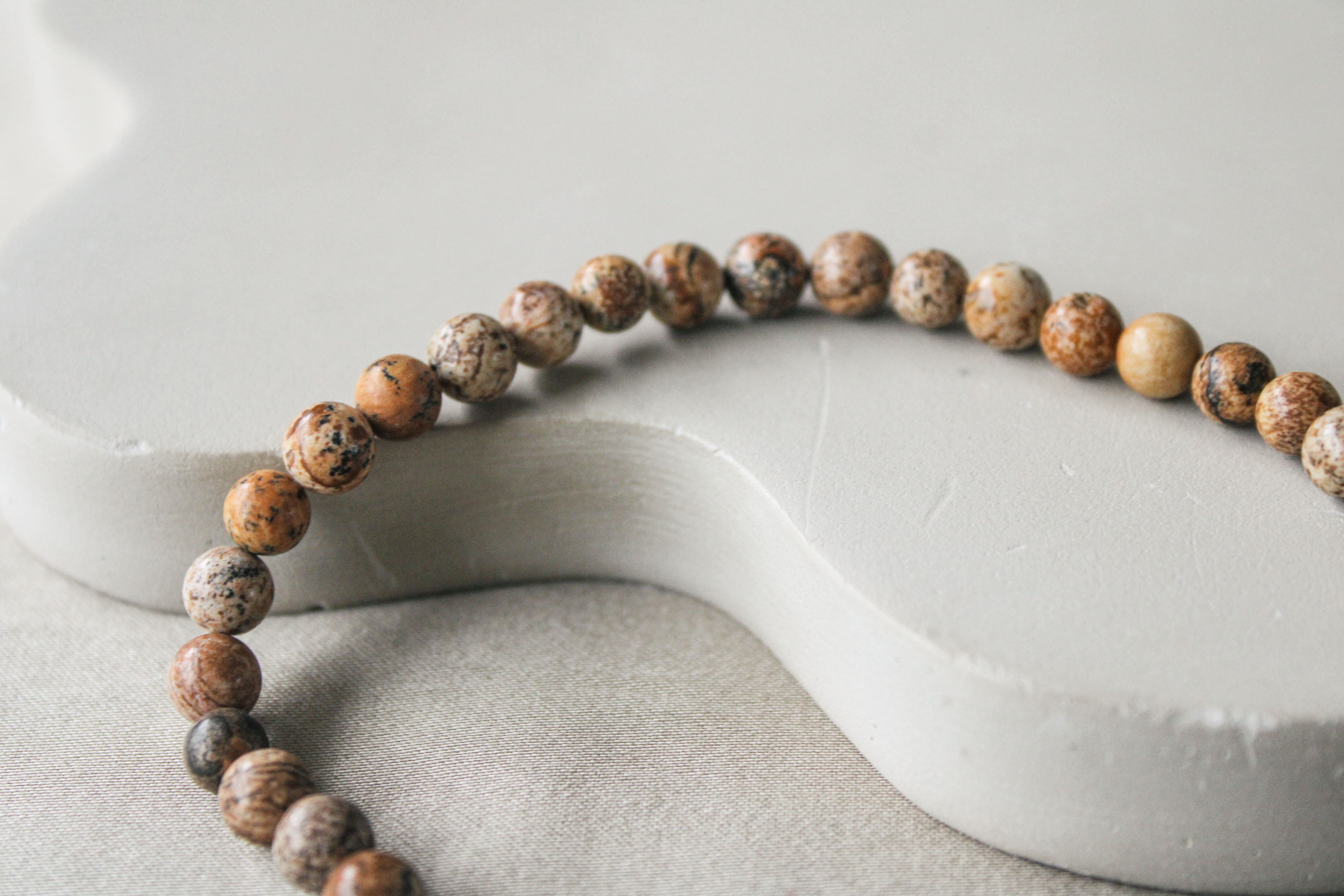 De landschapsjaspis edelstenen in deze armband zijn afkomstig uit een restpartij uit Frankrijk. Landschapsjaspis staat voor aarding en bescherming.