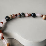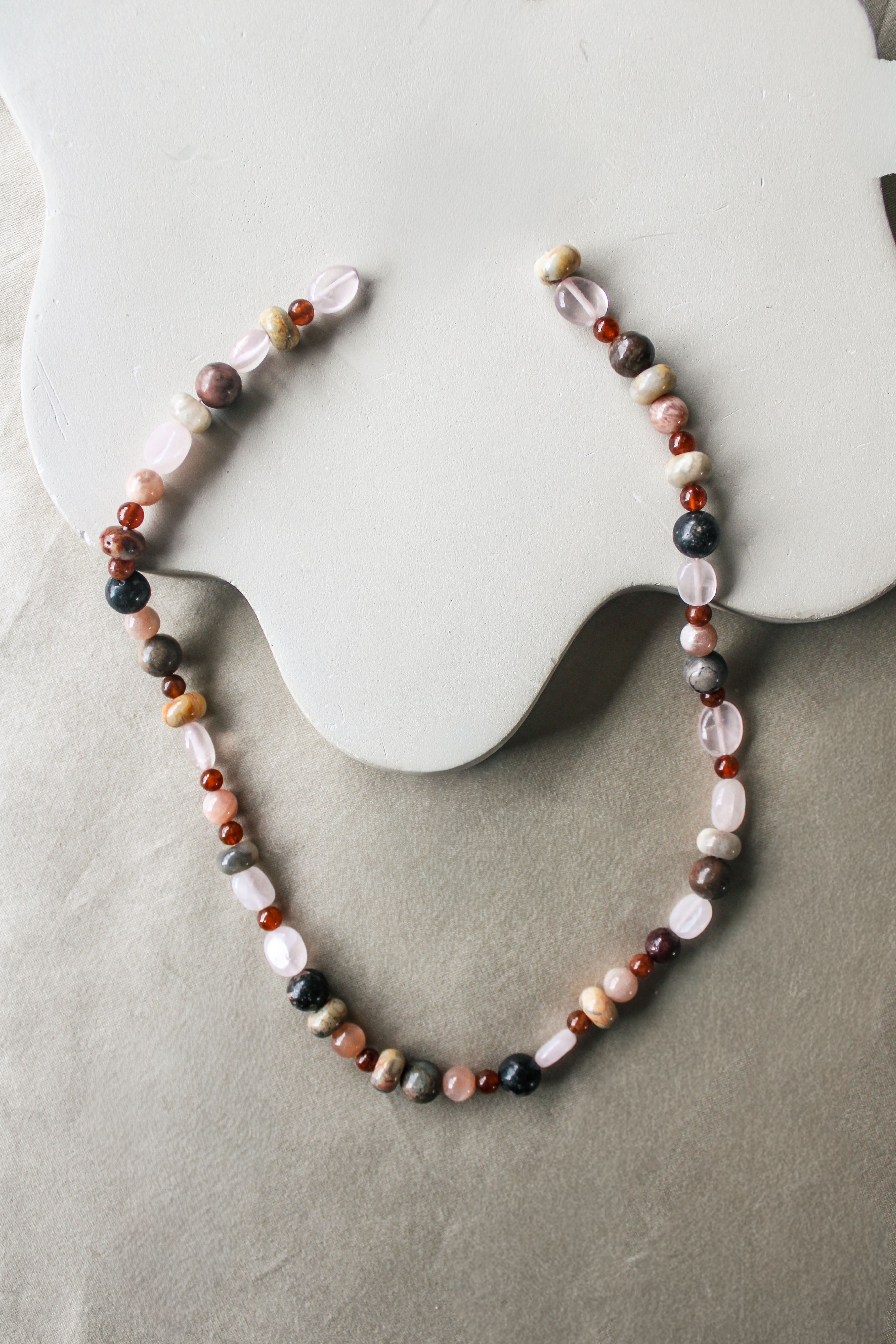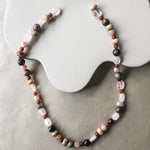 De 'Valerie' Edelsteen Ketting met Rozenkwarts en Hessoniet is handgemaakt met edelstenen (waaronder jade, landschapsjaspis en roze aventurijn) van een oud-sieradenmaker uit Frankrijk en Italië.