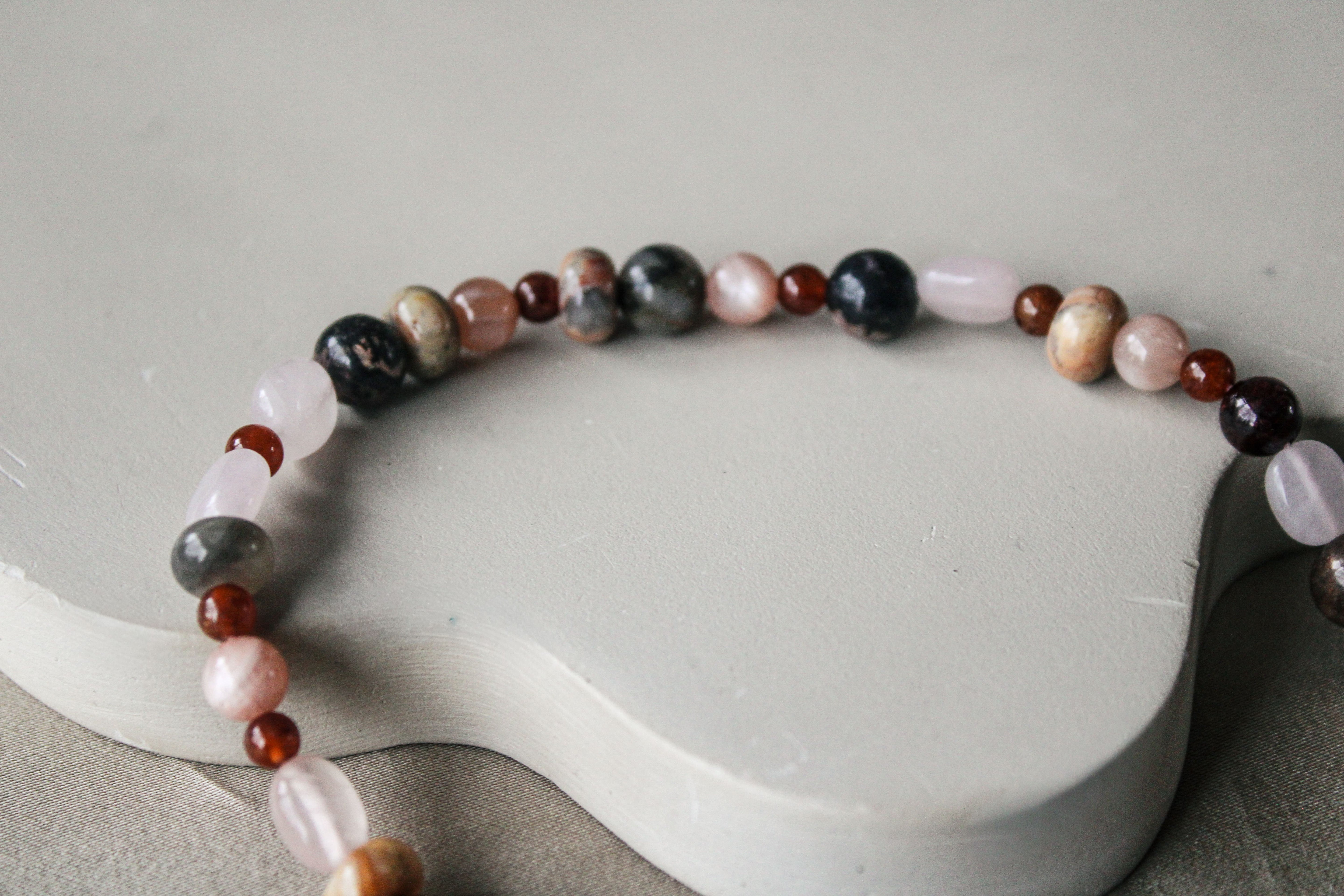 Ik selecteer de mooiste materialen en geef ze nieuw leven in mijn atelier. Deze edelstenen (waaronder jade, landschapsjaspis en roze aventurijn) zijn ooit overgebleven in het atelier van een oud-sieradenmaker.